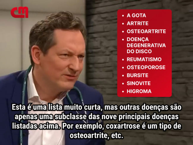 As doenças articulares que os portugueses estão tentando "curar" separadamente, foram combinadas na Europa em uma classe da doença chamada "calcinose articular". Isso inclui: