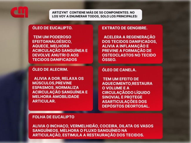Outro benefício importante da ArtiZynt é que contém um complexo de artrovitaminas sistêmicas e oligoelementos, projetados para melhorar o desempenho dos tecidos articulares. Ou seja, tem um efeito cicatrizante adequado no tecido ósseo e cartilaginoso, líquido sinovial, fibras musculares, ligamentos e tendões. Ou seja, tem uma ação abrangente e de amplo espectro.